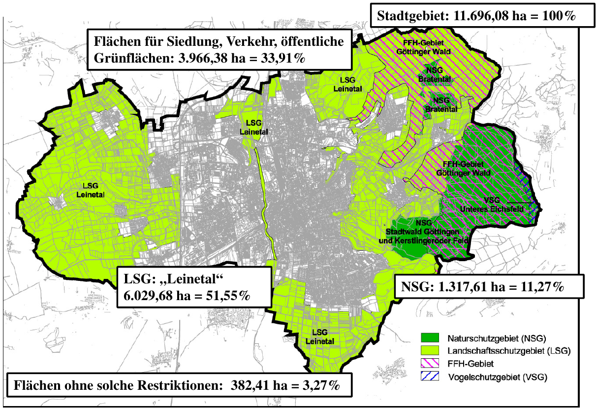 Für Göttingen(Stadt) wird eine Potentialfläche von 1380,2ha ermittelt, was mit 7,35% zu einer Fläche 101,4ha für die Windkraftnutzung führt. Wegen der Größe dieser Fläche geht damit das Land Niedersachsen implizit von der Windenergienutzung auch innerhalb des Landschaftsschutzgebietes aus.